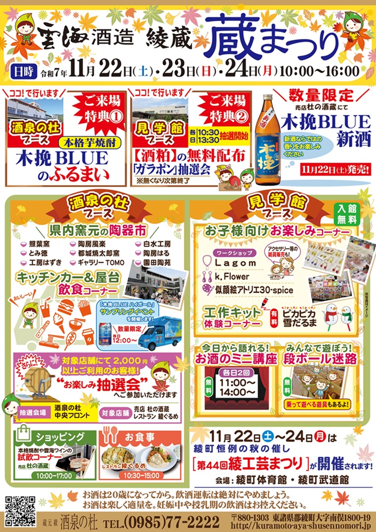 蔵元 綾 酒泉の杜・綾自然蔵見学館では、11月22日(土)、23日(日)、24日(月)に「雲海酒造 綾蔵 蔵まつり」を開催いたします。