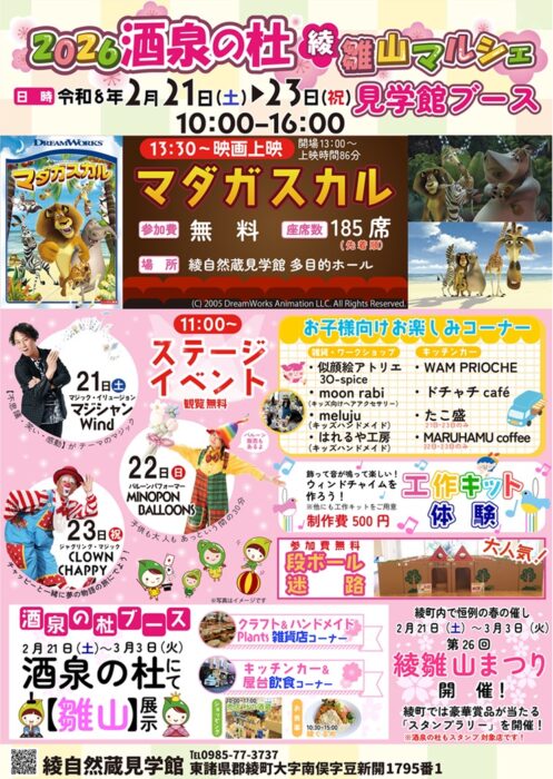 蔵元 綾 酒泉の杜・綾自然蔵見学館では、2月21日(土)~23日(祝)に「2026 酒泉の杜 綾雛山マルシェ」を開催いたします。