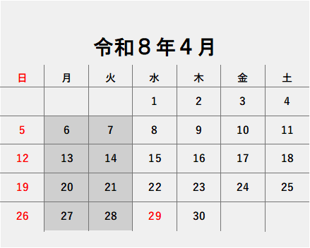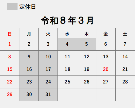 令和8年3月・4月の定休日は以下の通りになっております。