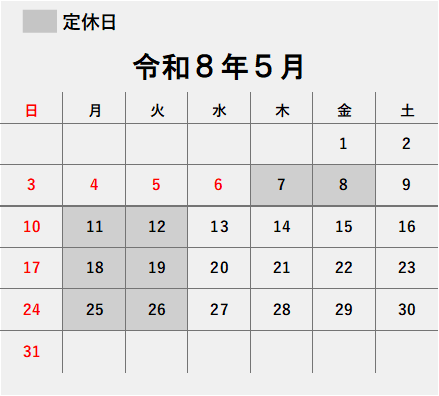 ※4日(月)・5日(火)はイベント開催のため営業、7日(木)・8日(金)が振替の定休日となります。